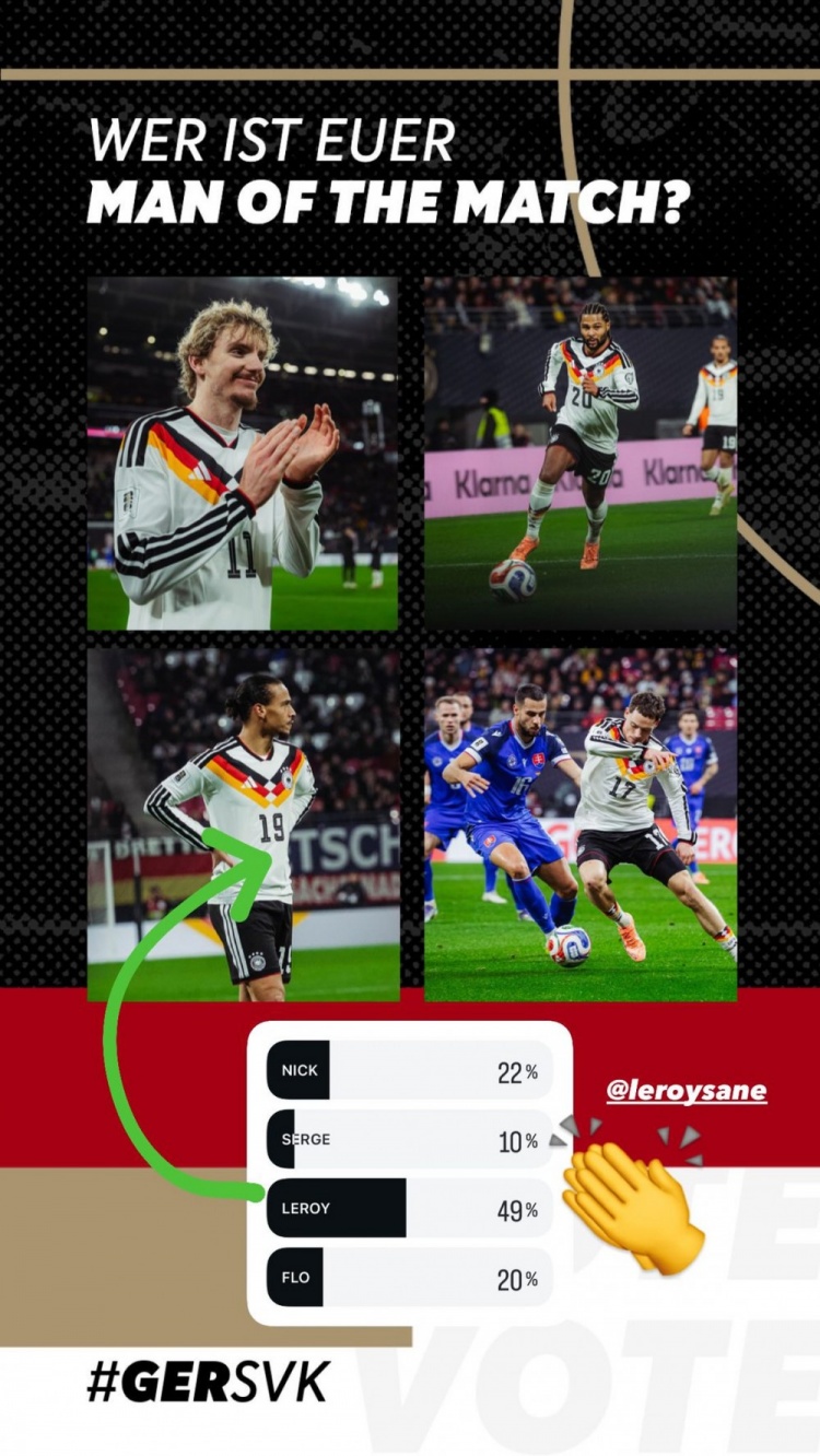 德国队官方文牍,本场双响的萨内在赛后的球迷票选措施获取49%投票,当选为德国队内本场最好球员。沃尔特马德获取22%票数,维尔茨20%、格纳布里则是10%。