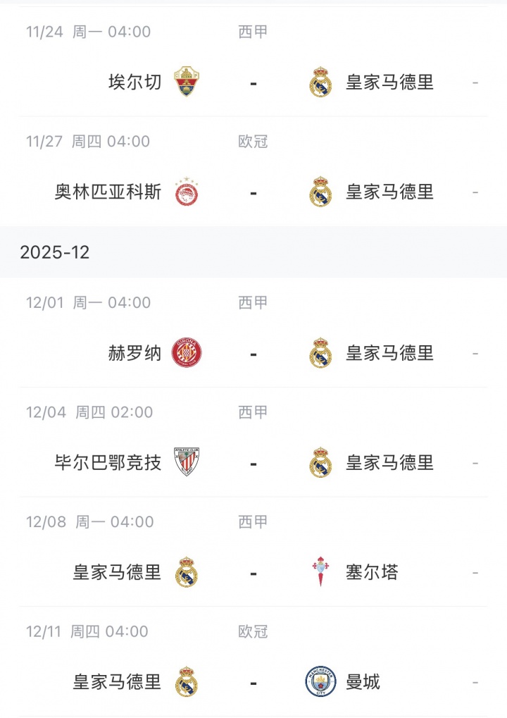 皇马将在海外比赛日放弃后迎来贯穿四个客场,以及将迎来与曼城的欧冠比赛,记者Picon觉得,这是对阿隆索的一次大考,他写谈:“贯穿三个客场征程,包括对阵本赛季黑马埃尔切与毕尔巴鄂竞技。而迢遥巨兽隐现:与曼城的对决,将成为履行这支球队是否具备抗衡欧洲顶级豪强实力的又一次大考——本赛季他们已两度失利。”