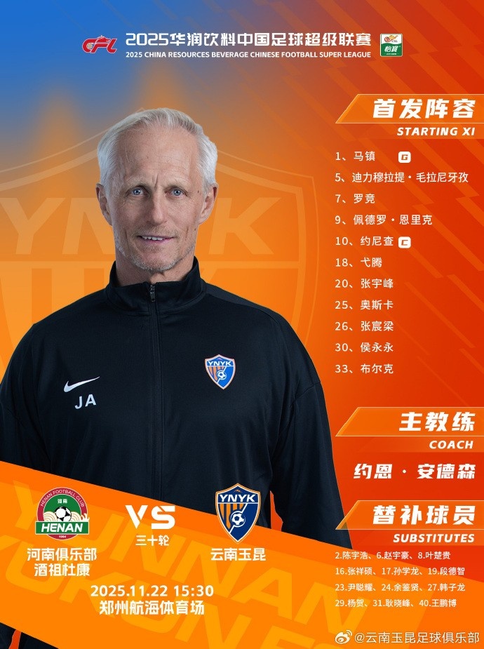 中超收官|河南vs玉昆首发:阿奇姆彭先发,奥斯卡、侯永永出战