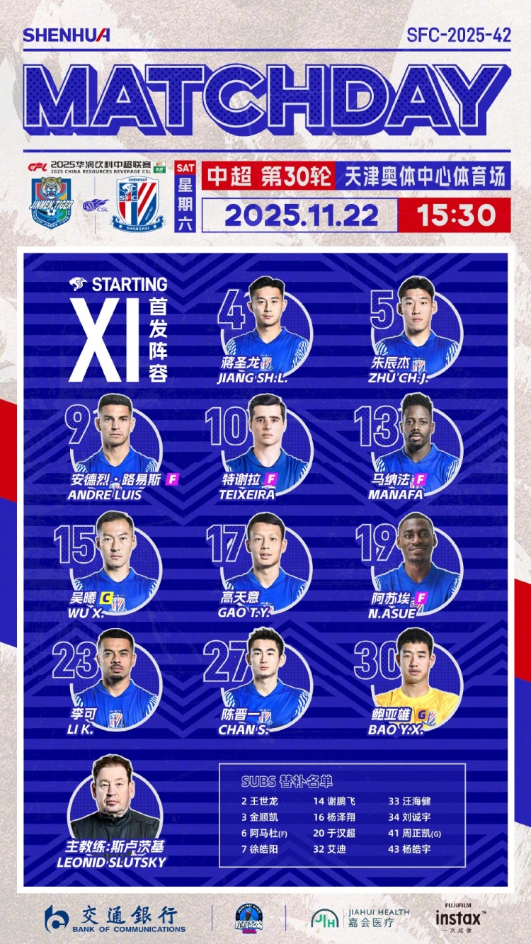 2025中超联赛第30轮:天津津门虎 vs 上海申花,首发名单