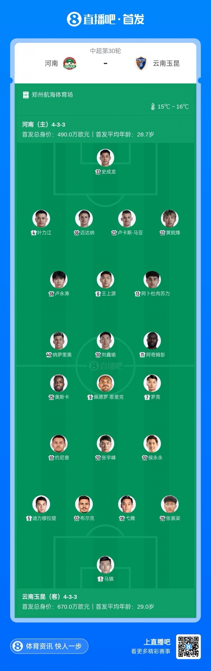 中超收官|河南vs玉昆首发:阿奇姆彭先发,奥斯卡、侯永永出战