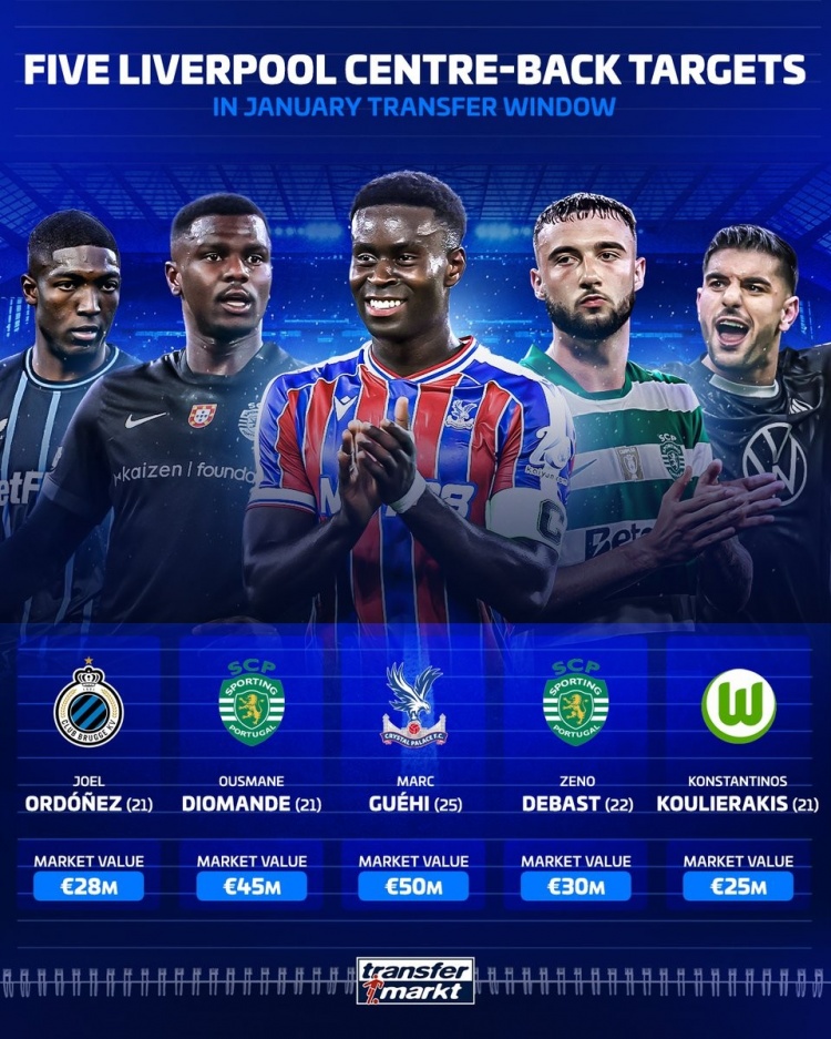11月25日讯 利物浦在本赛季进展高开低走,预测将在冬窗补强中卫位置,《转会阛阓》也列出了他们的五大潜在策画及德回身价: