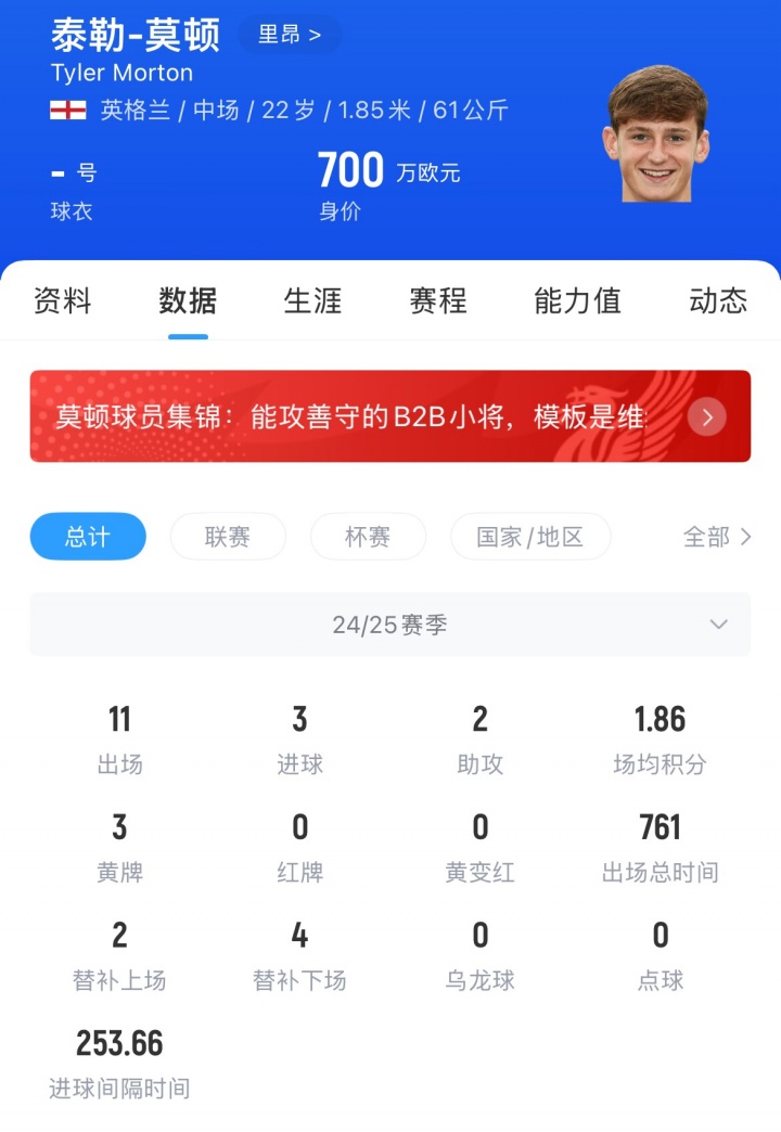 22岁的莫顿司职防护中场,他面前公约还有一年工夫,球员24-25赛季11场3球2助攻,德回身价700万欧。