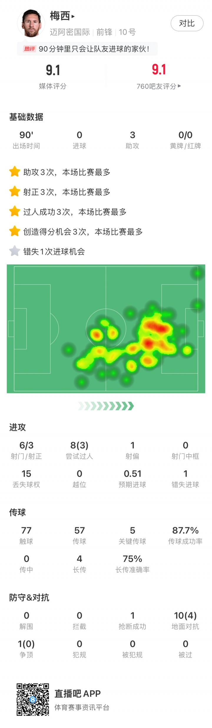 10月05日讯 好意思职联迈阿密4-1新英格兰革新,梅西单场3次助攻,6射3正1次错失进球契机,媒体评分9.1分。