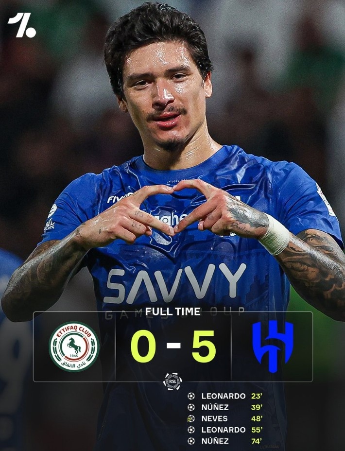 沙特联利雅得月牙5-0大捷达曼配合,努涅斯、莱昂纳多梅开二度