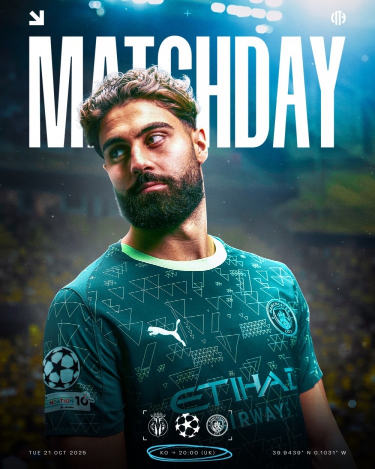 曼城发布欧冠客战比利亚雷亚尔海报:格瓦迪奥尔单东说念主出镜