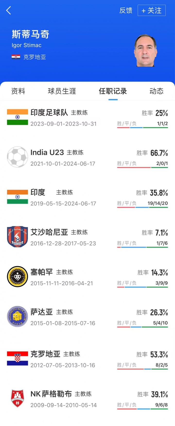 斯蒂马奇抓教印度国度队时期,53场比赛战绩为19胜14平20负,2024年6月离任,当今处于待业情状。