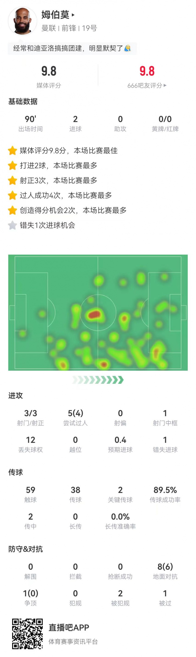 姆伯莫本场3射3正进2球+1失良机 5过东说念主4告捷 9起义6告捷 获9.8分