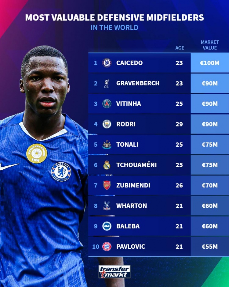 留心型中场身价榜:凯塞多1亿欧居首,赫拉芬贝赫9000万欧