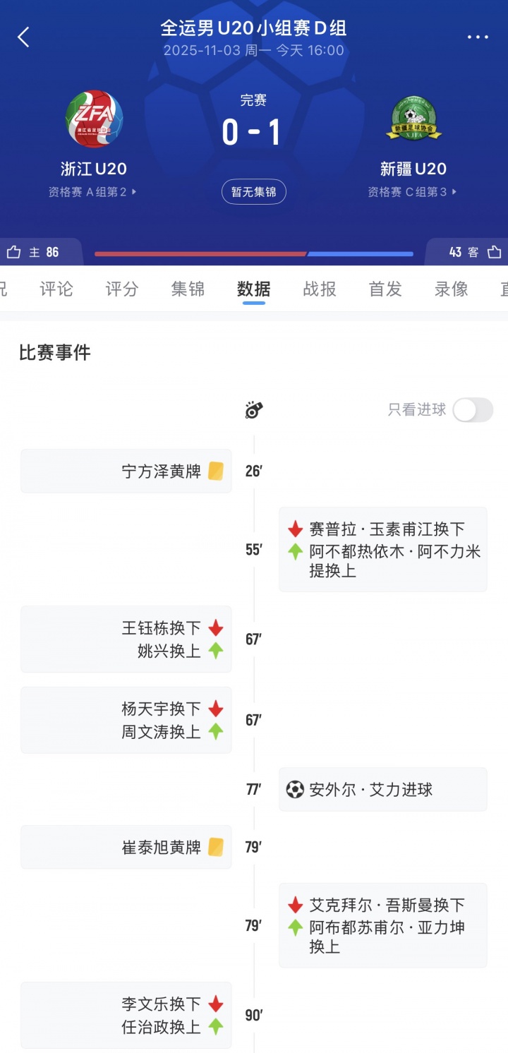 伏击段只打雷不下雨,驻防端也难以固若金汤。比赛第77分钟,新疆队打出分解反击,先锋安外尔-艾力禁区前推掷中计,龙套比分僵局的同期,也将浙江队的气运推向了峭壁边。最终,浙江队在我方的全运首战中0-1负于新疆队,兴师不利。