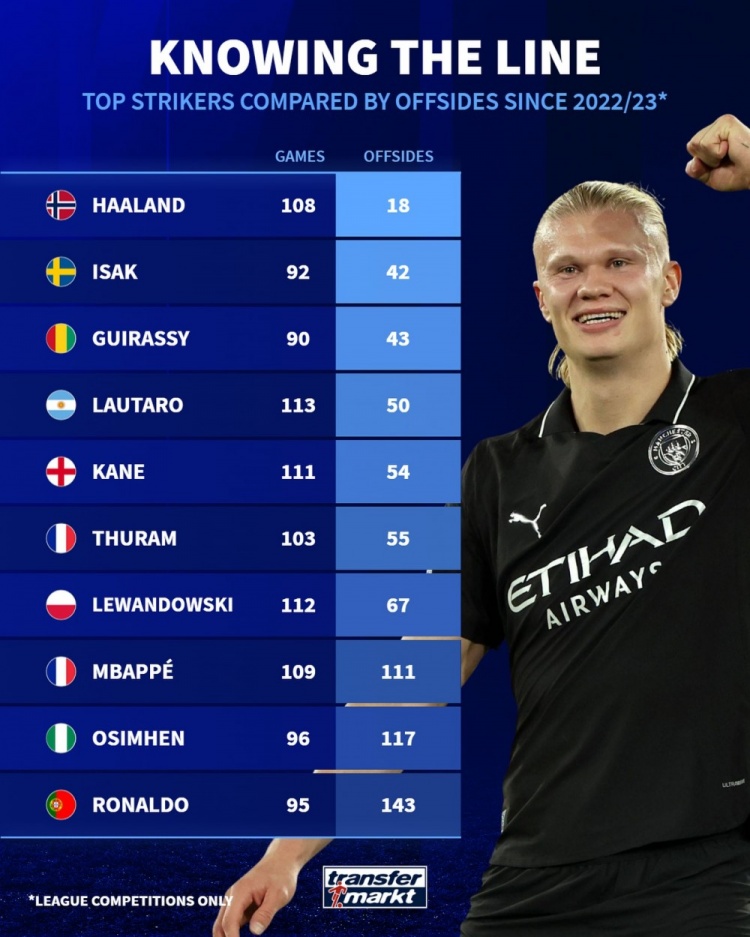 22-23赛季以来顶级先锋越位次数:哈兰德18次最少,C罗143次最多