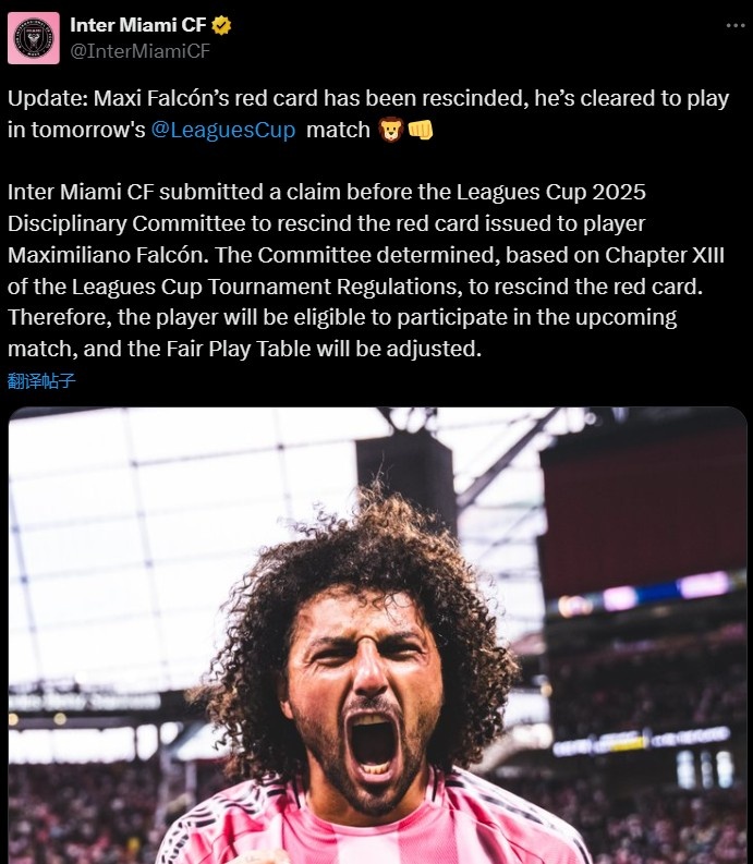 迈阿密官方写说念:“最新音信:法尔肯的红牌已被拆除,他将不错出战翌日的 定约杯比赛。”