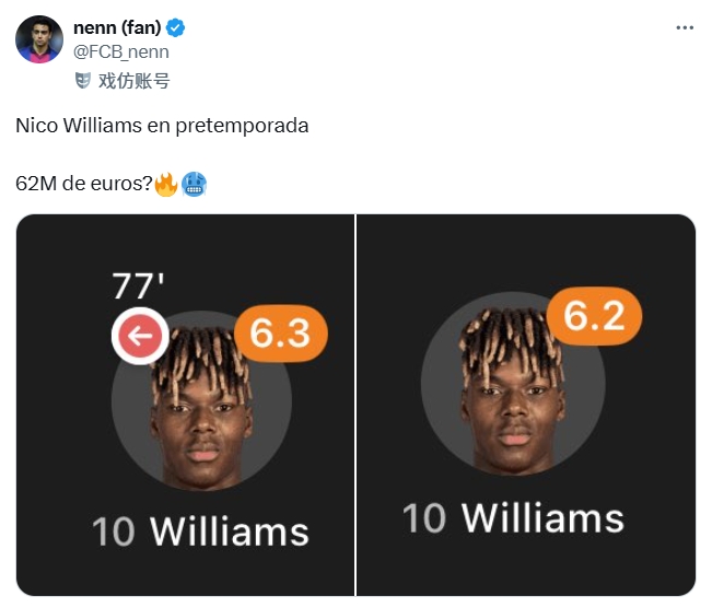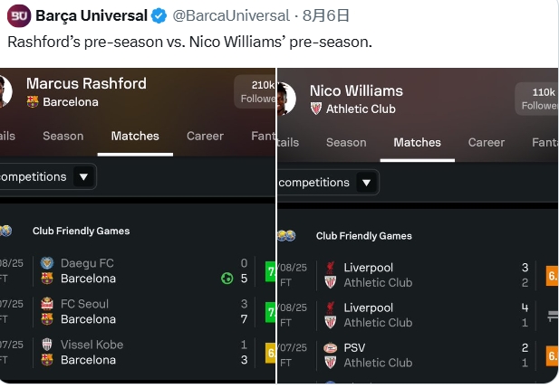 西班牙媒体eldesmarque报谈,此前繁密网友在社媒品评尼科与毕尔巴鄂续约后的季前赛弘扬,还有巴萨球迷号拿尼科与拉什福德季前赛弘扬对比。