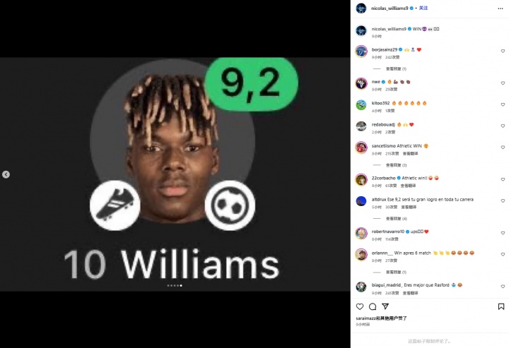 此前被球迷批弘扬差还与拉什福德对比,尼科传射后晒9.2评分回话