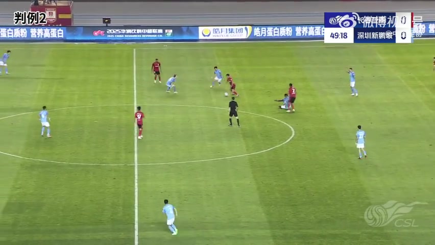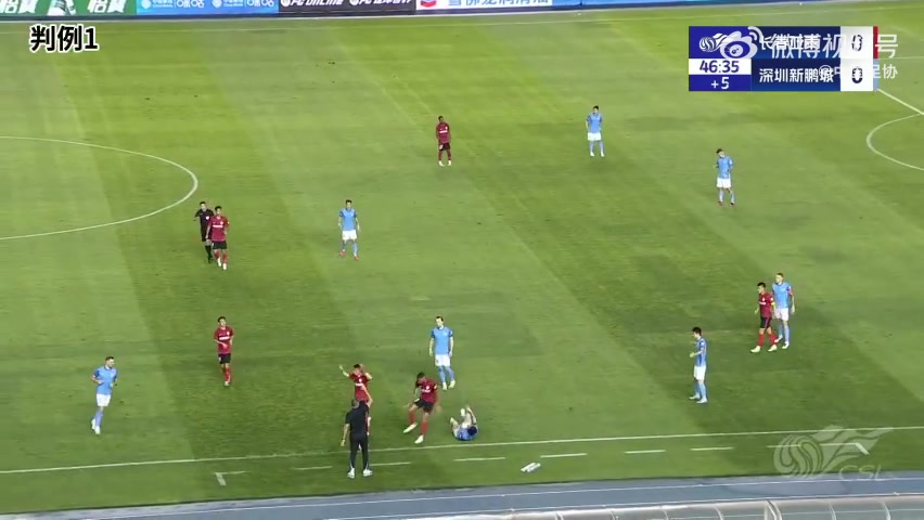 判例四:中超联赛第22轮,长春亚泰VS深圳新鹏城。比赛第90+6分钟,深圳新鹏城9号队员在对方罚球区内与长春亚泰4号队员争抢高空球发生战争后倒地,评判员未判罚犯规。VAR未介入。
