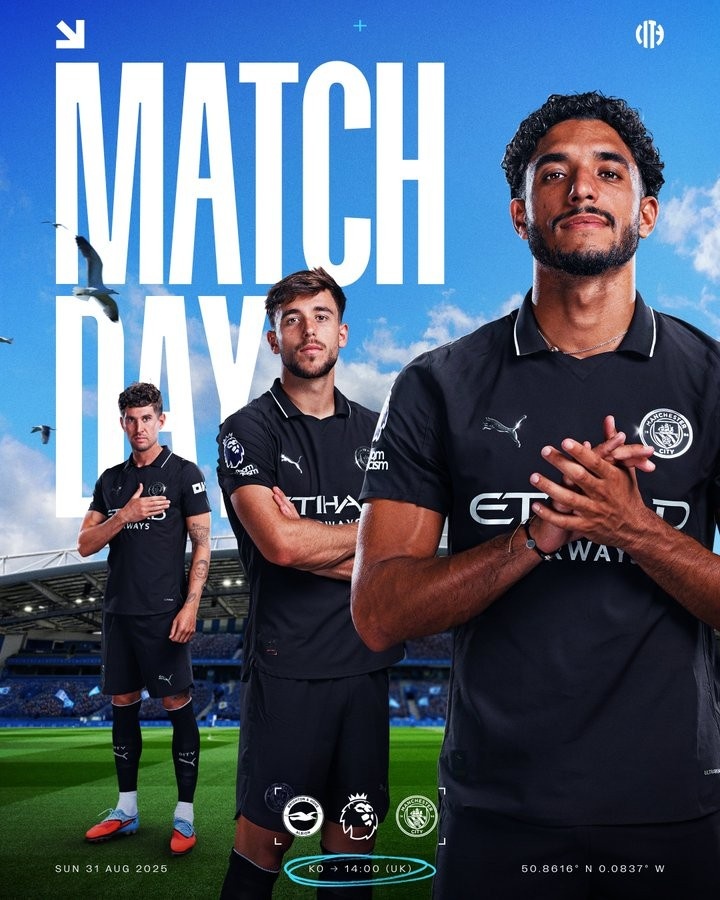 8月31日讯 今晚,曼城将在英超客场挑战布莱顿,俱乐部官推晒出海报预热。