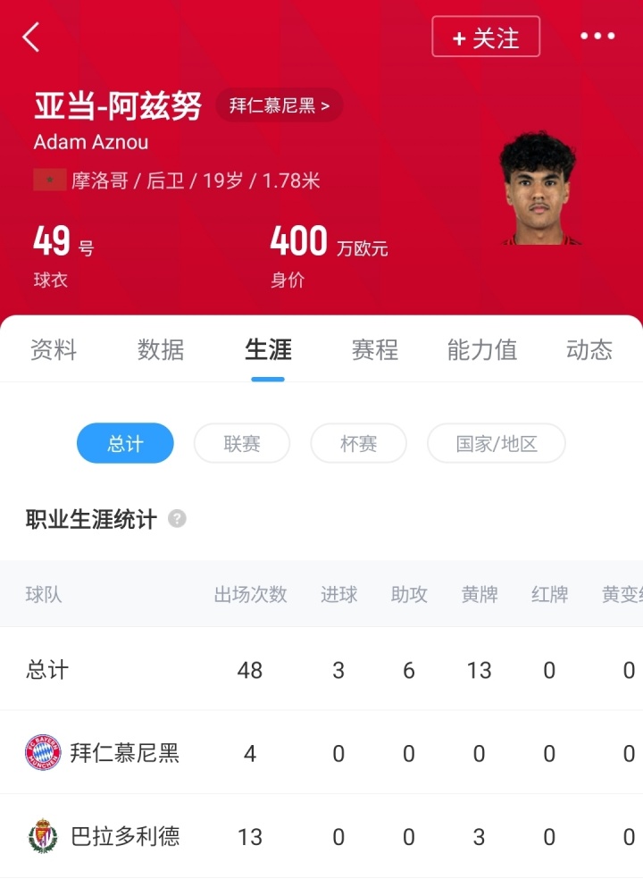 阿兹努是摩洛哥国度队成员,出生于巴塞罗那有名的拉玛西亚青训营,青少年时辰在巴萨效用三年,之后于2023年夏天转会至拜仁慕尼黑。
