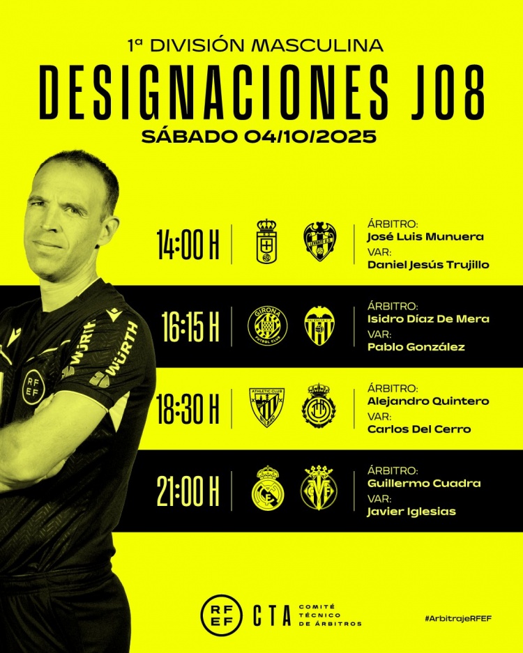西甲10月4日比赛裁判安排:吉列尔莫-夸德拉规定皇马vs黄潜