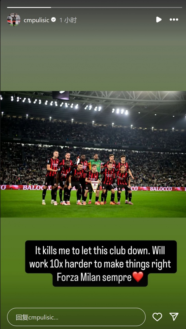普利西奇社媒晒出首发球员赛前的合照,并写谈:“让俱乐部失望令我痛彻情感,我会付出十倍戮力来弥补一切,米兰永恒加油!”