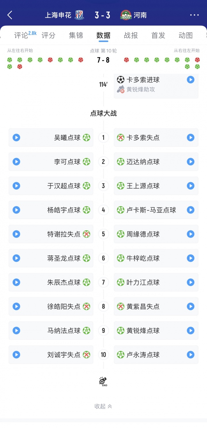 足协杯河南淘汰申花,点球大战10轮决胜!河南门将徐嘉敏三扑点,申花门将薛庆浩两次扑点。以下是点球全程回放: