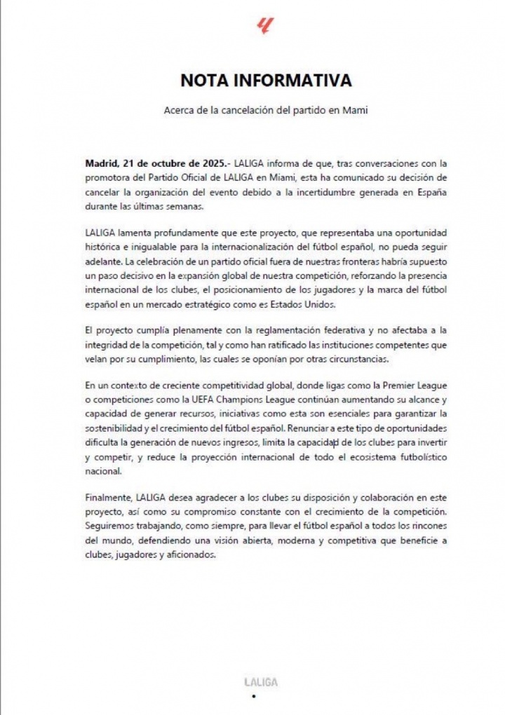 西甲定约发布声明称,经与迈阿密官方联赛赛事专揽方有计划,鉴于西班牙昔时数周内产生的不信服性,专揽方已决定取消本次赛事组织。