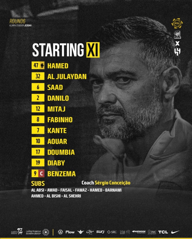 吉达集中首发:47-哈麦德、32-朱莱丹、6-萨德-穆萨、2-达尼洛、12-米塔赫、8法比尼奥、7-坎特、10-奥亚尔、17-敦比亚、19-迪亚比、9-本泽马