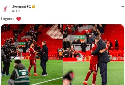 利物浦官方推特发文写说念:传闻!并配上了杰拉德和萨拉赫在场边拥抱的图片。