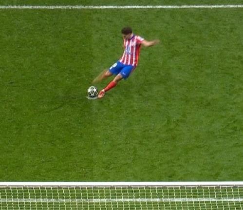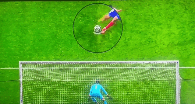 马竞的阿尔瓦雷斯被判罚球无效,适用的亦然这一案例情况。他的左脚幽微打滑,接近了皮球,右脚射出球时,疑似从左脚脚背擦过。