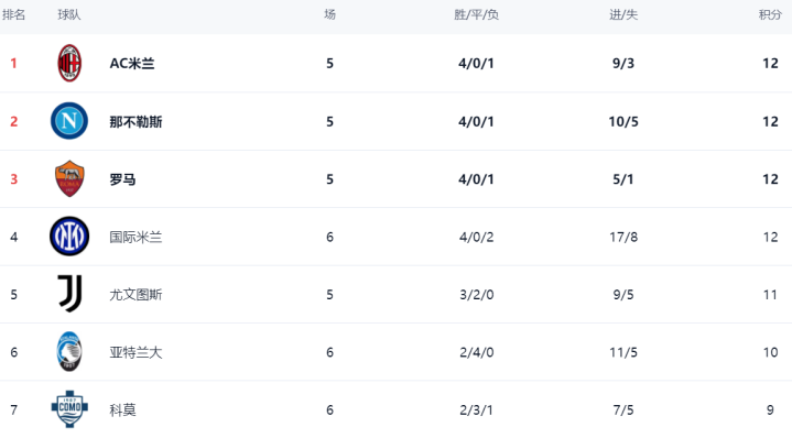 在积分榜上,榜首易主,海外米兰以12分登上了榜首位置。还有3支球队亦然12分,但净胜球不如海外米兰。AC米兰、那不勒斯和罗马排行第2到第4,这些球队都比海外米兰少踢1轮。尤文图斯以11分排行第5。亚特兰大只拿到10个积分NFL赛事,排行第6。科莫、萨索洛和克雷莫内塞都是9个积分。而拉皆奥只拿到7分,排行第10。