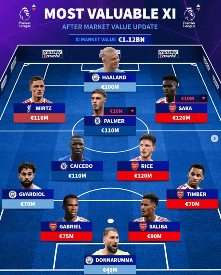 北京时间3月10日,德国转会市场在3月9日完成了英超球员的最新身价更新,同步推出了更新后的英超身价最贵阵容。这套11人阵容的总身价达到11.2亿欧元,人员分布也直接体现了当下英超各队的阵容实力。