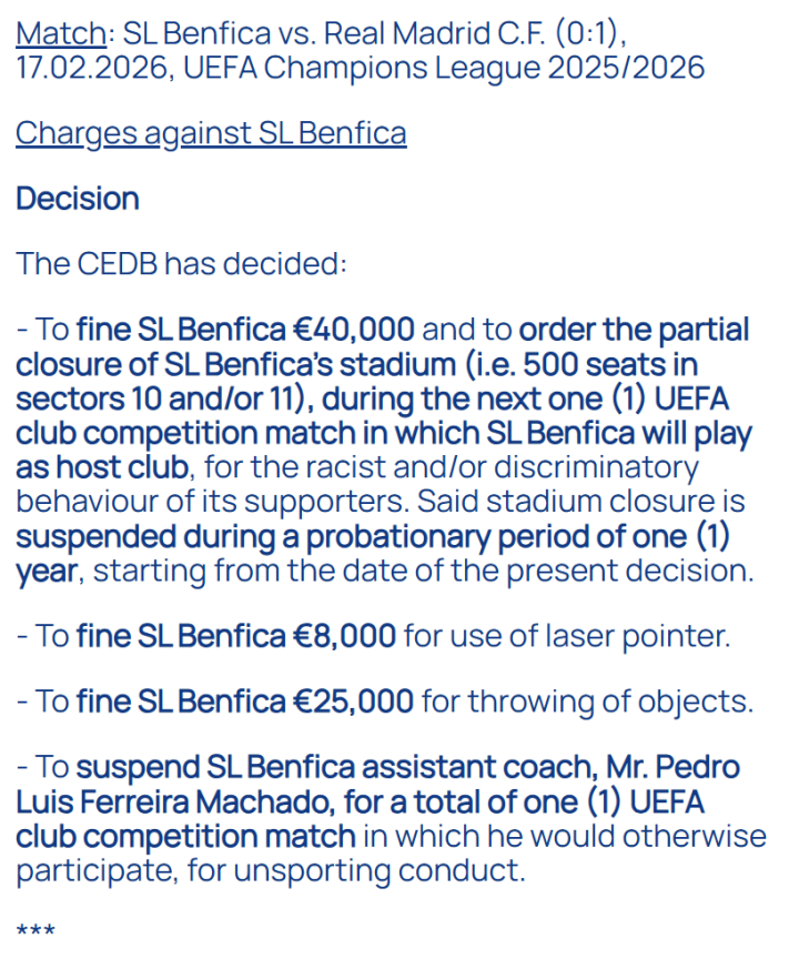 根据处罚决定,本菲卡将被处以4万欧元罚款,并要求在其下一场欧足联俱乐部赛事主场作战 赛事 中关闭部分看台(第10和/或第11看台共500个座位),原因是球迷存在种族主义或歧视行为。不过,该看台关闭处罚将进入为期一年的观察期,自本决定生效之日起暂缓执行。