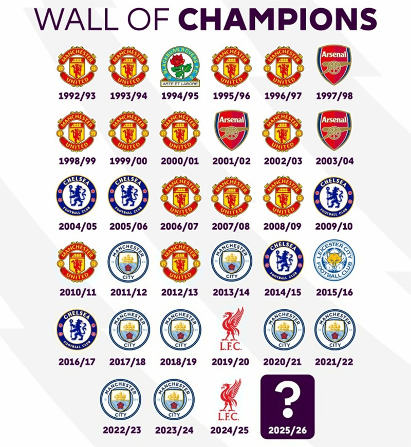 从冠军墙不错看出,33年的英超,大约不错分别为两个阶段,前半段的冠军,队徽频频王人是红色的,从2013赛季初始,大部分的冠军王人形成了蓝色。