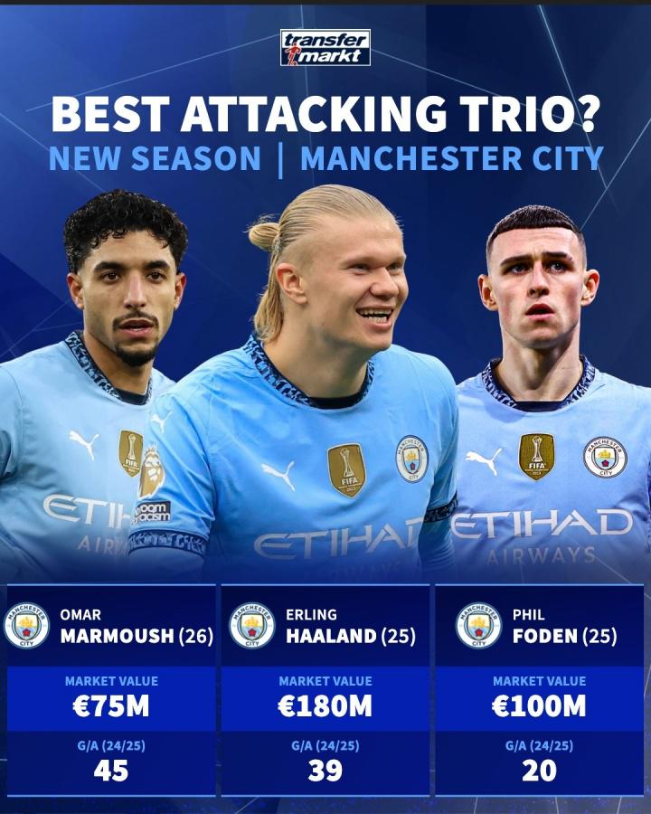 曼城:马尔穆什(7500万欧)+哈兰德(1.8亿欧)+福登(1亿欧)