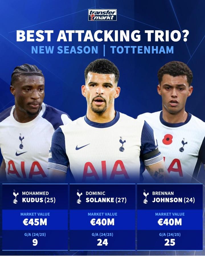 热刺:库杜斯(4500万欧)+索兰克(4000万欧)+约翰逊(4000万欧)