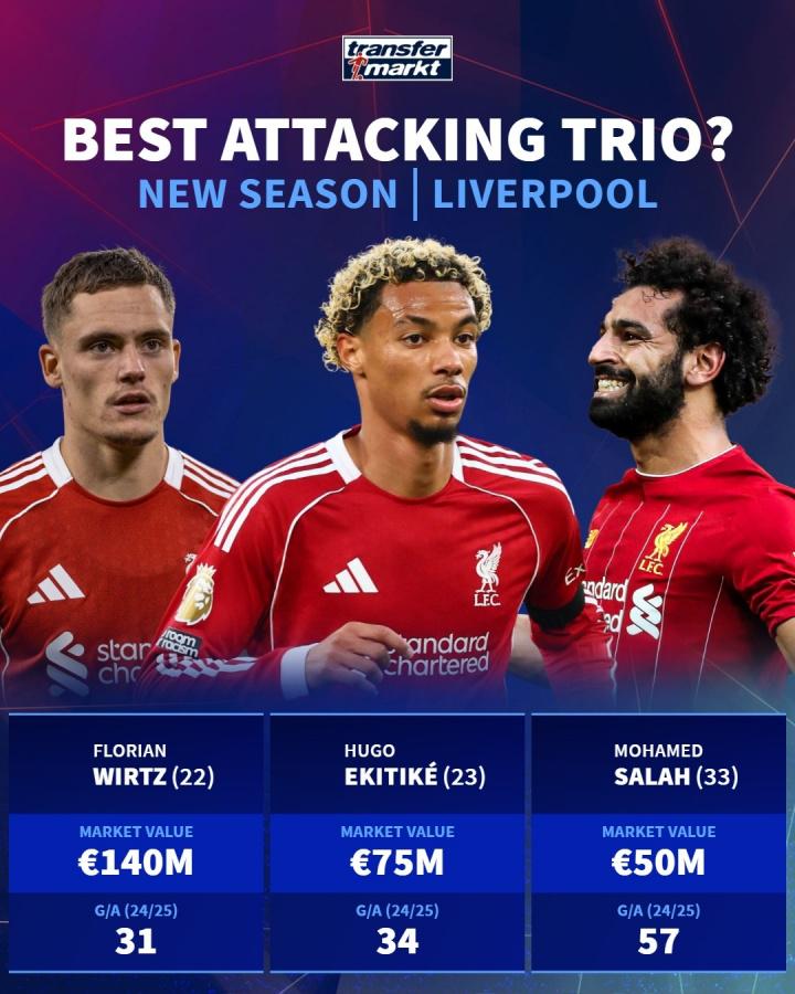 利物浦:维尔茨(1.4亿欧)+埃基蒂克(7500万欧)+萨拉赫(5000万欧)