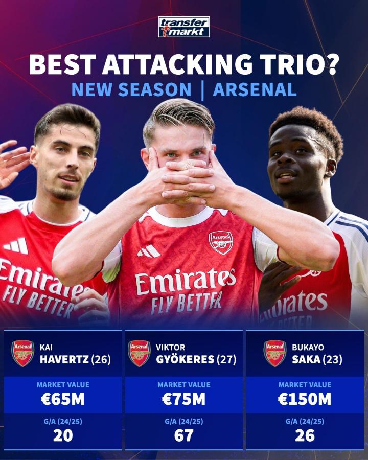 阿森纳:哈弗茨(6500万欧)+约克雷斯(7500万欧)+萨卡(1.5亿欧)
