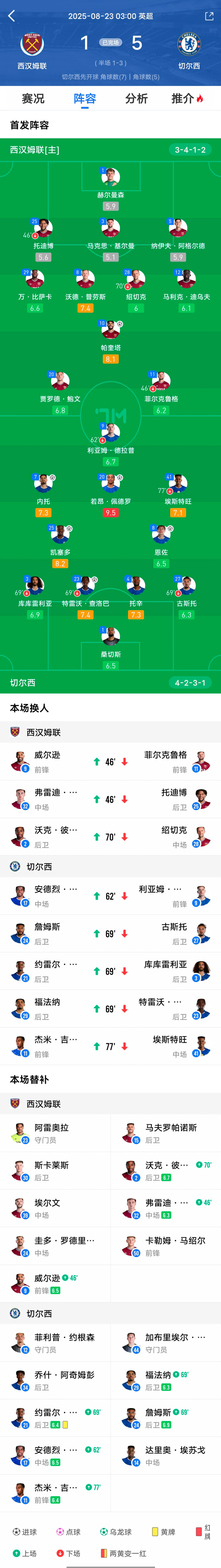 北京技巧3:00,英超第2轮西汉姆联vs切尔西,比赛在伦敦碗打响!上半场,帕奎塔6分钟寰球波破门!若昂-佩德罗头球破门飞速扳平!菲尔克鲁格破门被吹越位;随后若昂-佩德罗助攻内托反超比分,埃斯特旺助攻恩佐再下一城!下半场,凯塞多、查洛巴均在角球中破门,大王人西汉姆联球迷59分钟早早离场!最终,切尔西5-1大捷西汉姆联,获得赛季首胜!西汉姆联遭逢2连败! 【比赛要道事件】 第6分钟,帕奎塔带球上前无东谈主收敛,禁区前平直远距离重炮轰门!皮球莫得任何旋转洞穿球门!西汉姆联1-0泉源切尔西。 第15分钟,切尔西右侧角球契机,前点库库雷利亚头球摆渡,若昂-佩德罗头球辛勤破门!切尔西1-1扳平西汉姆联。 第17分钟,西汉姆联右路低平球传中,第一脚射门被挡出,随后菲尔克鲁格爆射破门!不外托迪博越位了,进球无效。 第23分钟,查洛巴抢断帕奎塔,若昂-佩德罗传中,后点内托包抄破门!切尔西2-1反超西汉姆联。 第34分钟,切尔西前场断球,埃斯特旺衔尾过东谈主下底横扫门前!恩佐包抄破门!切尔西3-1泉源西汉姆联。 第54分钟,切尔西左路角球契机,皮球开到门前,门将赫尔曼森扑球诞妄,后点凯塞多弹射破门!切尔西4-1西汉姆联。 第58分钟,又是角球!内托主罚右侧角球,皮球被顶到后点,若昂-佩德罗头球作念球,查洛巴门前凌空破门!切尔西5-1泉源西汉姆联。 第59分钟,大王人西汉姆联球迷提前离场。 【比赛焦点转眼】 第13分钟,若昂-佩德罗倒在西汉姆联禁区内,不外主裁暗示莫得问题。 第25分钟,古斯托脚部有些不适,但并无大碍,连续比赛。 第45+4分钟,鲍文禁区内尝试倒钩,力量小了。 第50分钟,内托左路横扫禁区内,恩佐高速插上,点球点位置的推射逾越球门。 第68分钟,西汉姆联禁区前凌空射门,桑切斯反馈飞速,神扑救险。 第73分钟,里斯-詹姆斯超远距离手术刀直塞,埃斯特旺杀入禁区,调度到左脚再敲门,被门将扑住。 第89分钟,西汉姆联赢得禁区前位置可以的恣意球,沃德-普劳斯平直敲门,皮球击中东谈主墙出了底线。 第90+1分钟,内托近距离头球击中阿格德手臂,主裁判暗示莫得问题。
