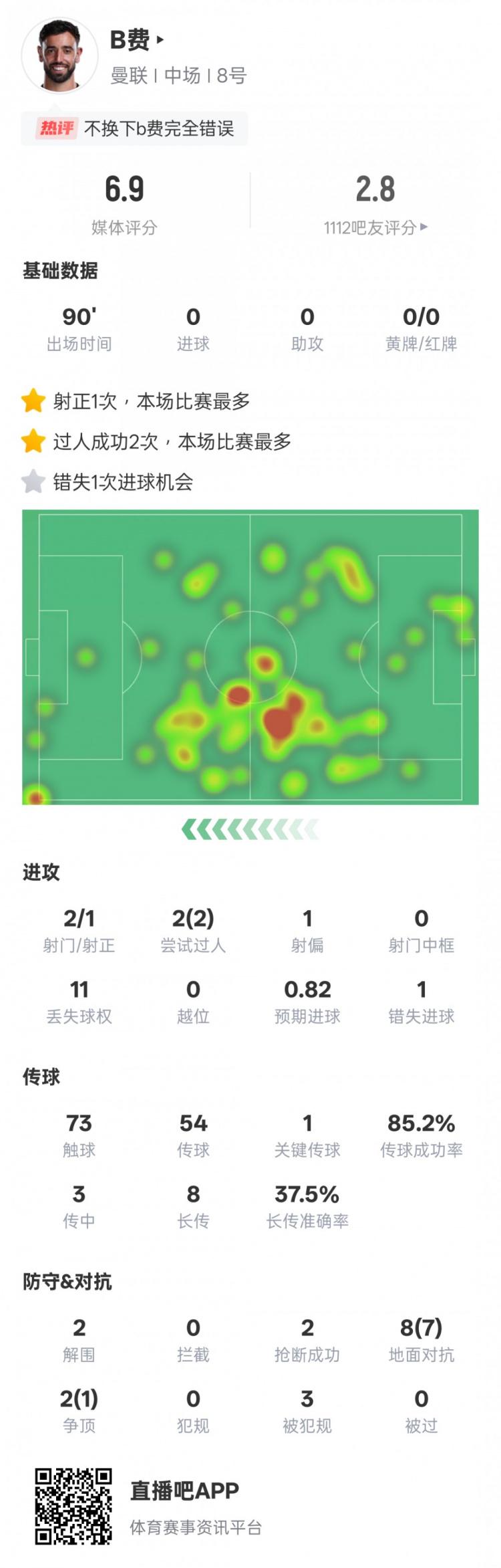 直播吧8月25日讯 2025-26赛季英超第2轮,曼联客场1-1富勒姆。B费首发出战,罚丢点球,另外他有2次过东谈主奏效和1次要津传球,评分6.9。