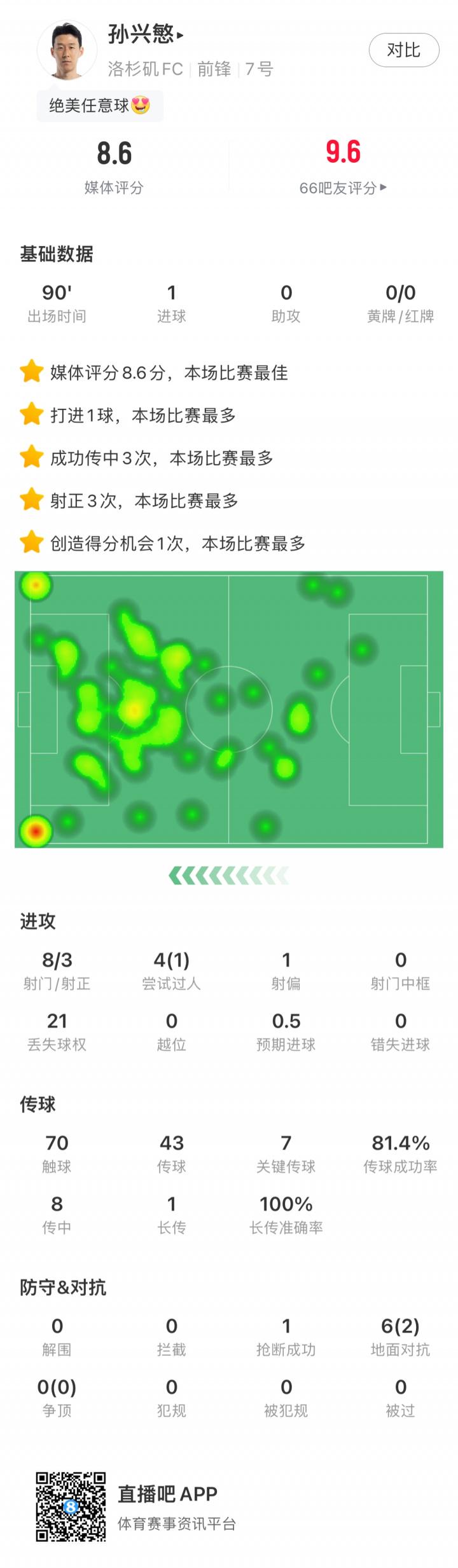 亚洲一哥!孙兴慜本场数据:8射3正+自便球破门,7次关节传球