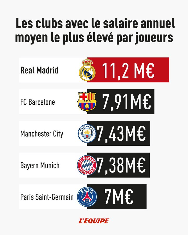 虎扑08月26日讯据专科网站Betideas和Capologydata报谈,皇家马德里在2025-2026赛季的球员东谈主均年薪为1120万欧元,这是欧洲大大量朱门俱乐部水平的60%以上。不外,这一数字较上赛季略有下落——那时皇马的东谈主均年薪逾越1200万欧元。