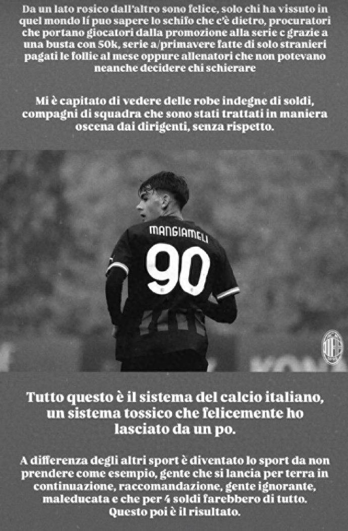 说话的人叫费德里科·曼贾梅利,2005年出生,曾经在AC米兰U17、U19梯队射门。他没等到升入一线队就离开了,离开得很彻底——直接退圈。国家队出局后,他在社交媒体上写下了一长段文字,字字扎心。