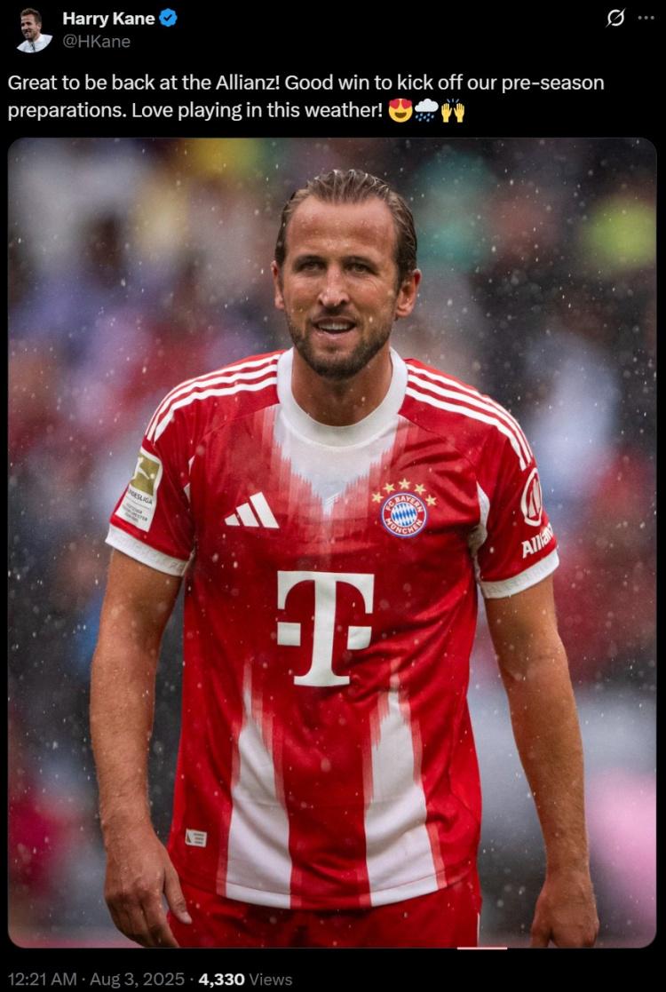 赛后凯恩在社媒发文:很欢笑再次回到安联球场,这场得胜拉开了咱们季前备战的序幕,可爱在这么的天气里踢球!