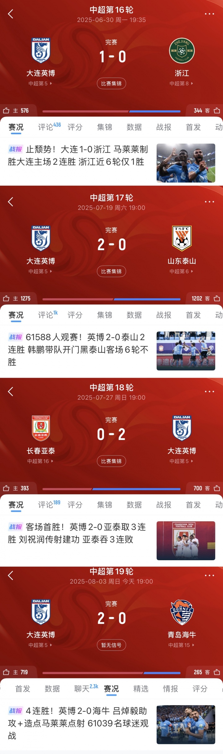 大连英博联赛4连胜:零封浙江、泰山、亚泰、海牛