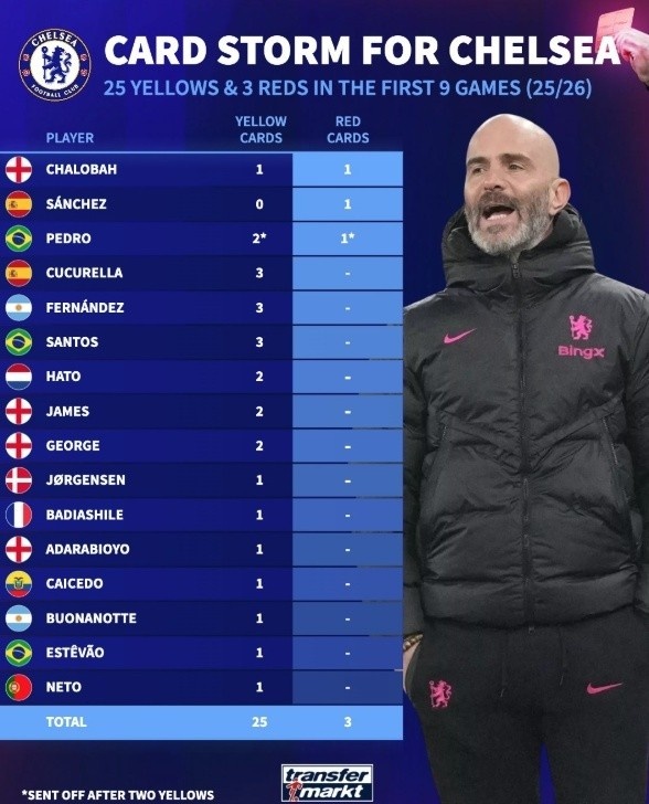 10月1日讯 德国转会阛阓统计,切尔西新赛季前9场比赛,领到25张黄牌和3张红牌。