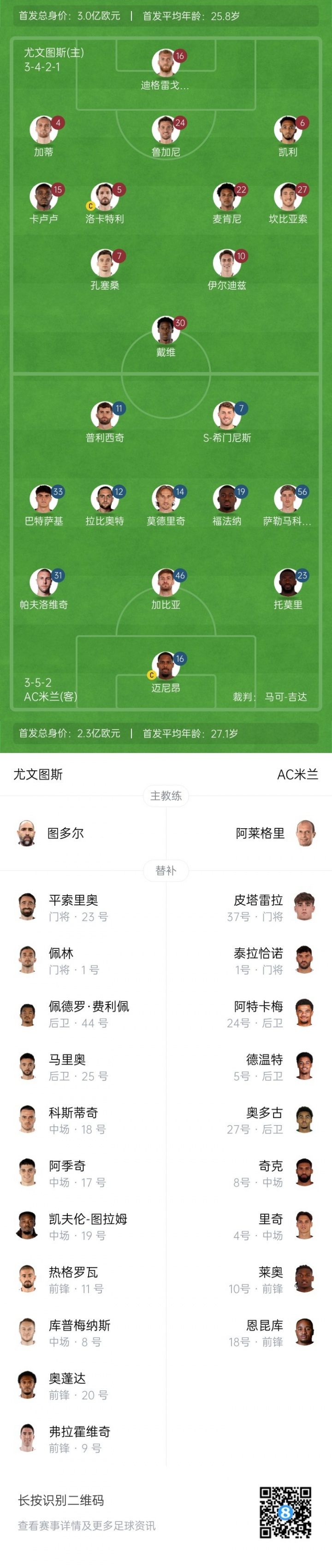 米兰替补:37-皮塔雷拉、1-泰拉恰诺、24-阿特卡梅、5-德温特、27-奥多古、8-奇克、4-里奇、10-莱奥、18-恩昆库