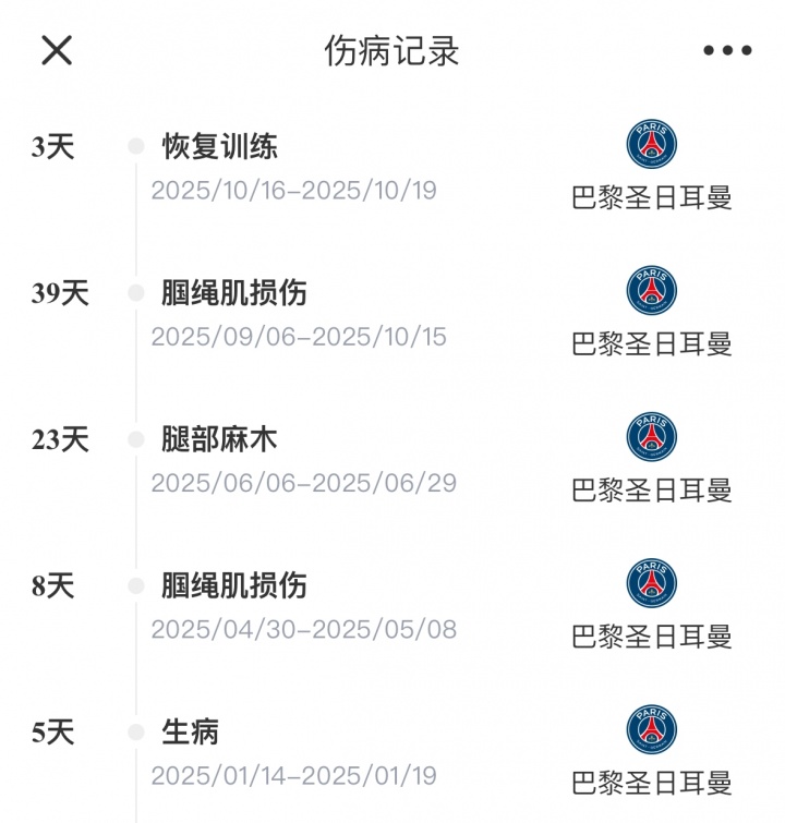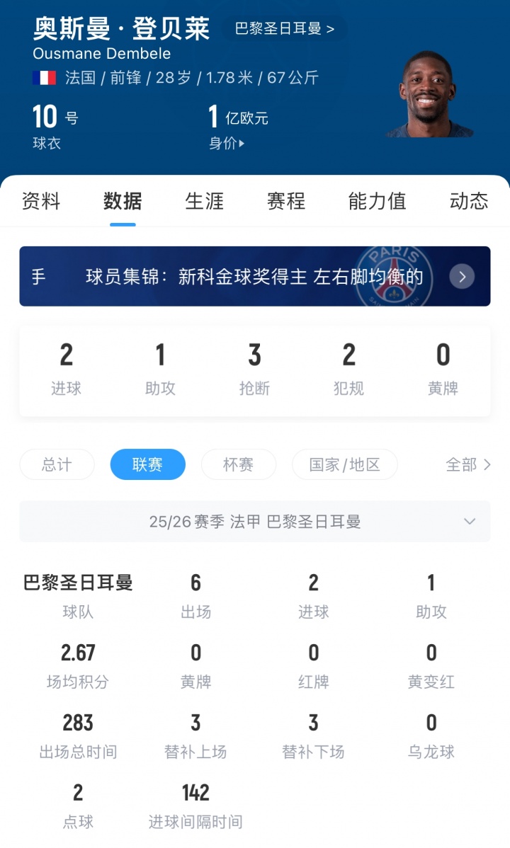 这是28岁的登贝莱本赛季第三次受伤,他本赛季还是缺席了16场比赛中的7场,伤缺44天。他本赛季于今仅为巴黎出战6场法甲、2场欧冠和1场欧超杯,孝敬3球2助,整个425分钟,其中仅在欧超杯打满全场。