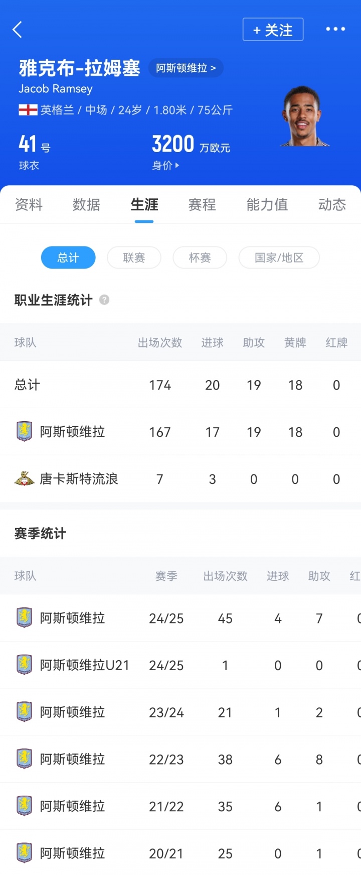 拉姆塞是维拉青训树立的球员,6岁就加入维拉青训学院,2019年与维拉签署作事合同。截止当今,拉姆塞为维拉出战137次打入14球,他的德回身价是3200万欧元。