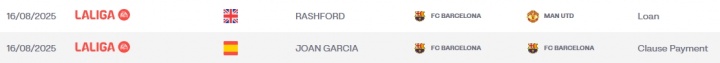 至此,巴萨今夏的两名主要新援门将霍安-加西亚和拉什福德王人完成了在西甲的注册。