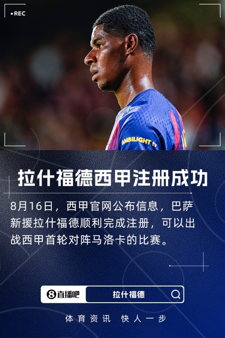 08月16日讯 据西甲官网泄漏,巴萨今夏新引进的前卫拉什福德如故完成注册,他将不错投入新赛季西甲首轮比赛。