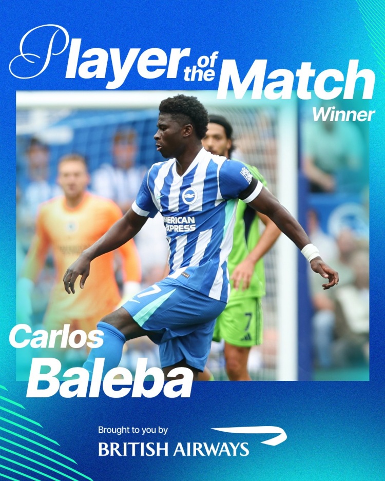 8月17日讯 本赛季英超首轮,布莱顿1-1富勒姆。赛后,布莱顿中场巴莱巴当选队内最好球员。